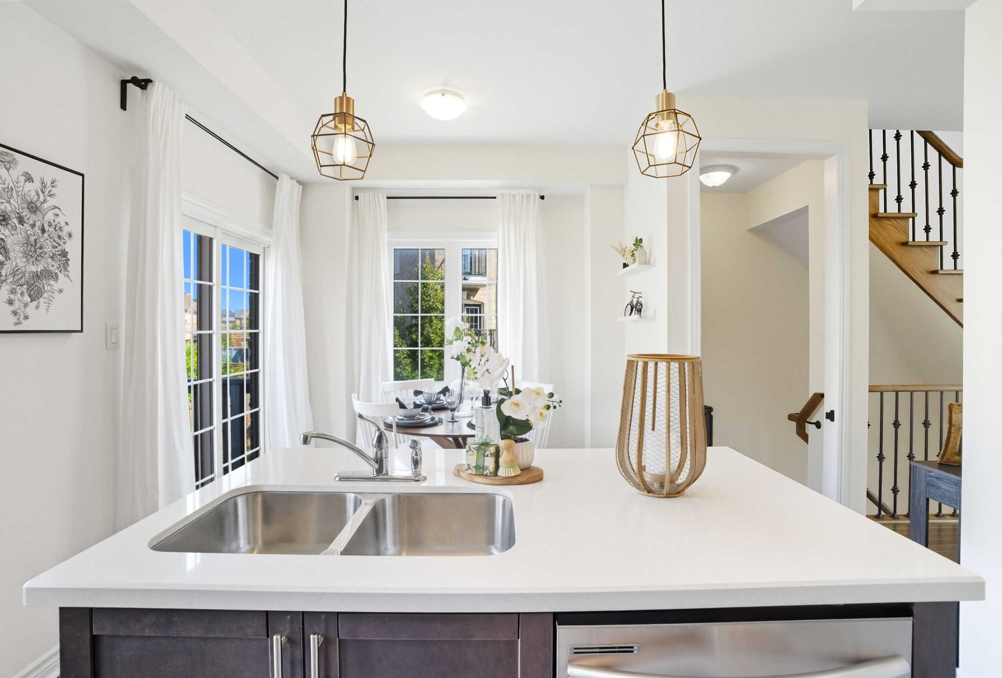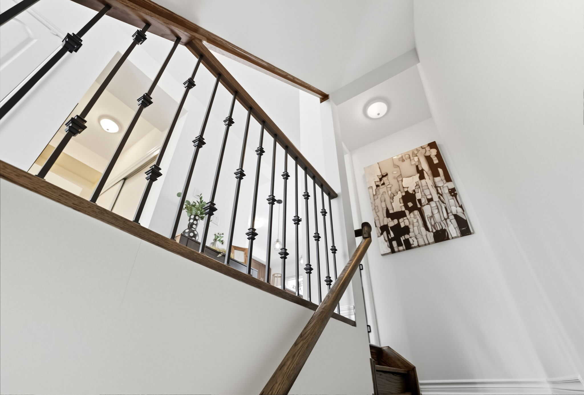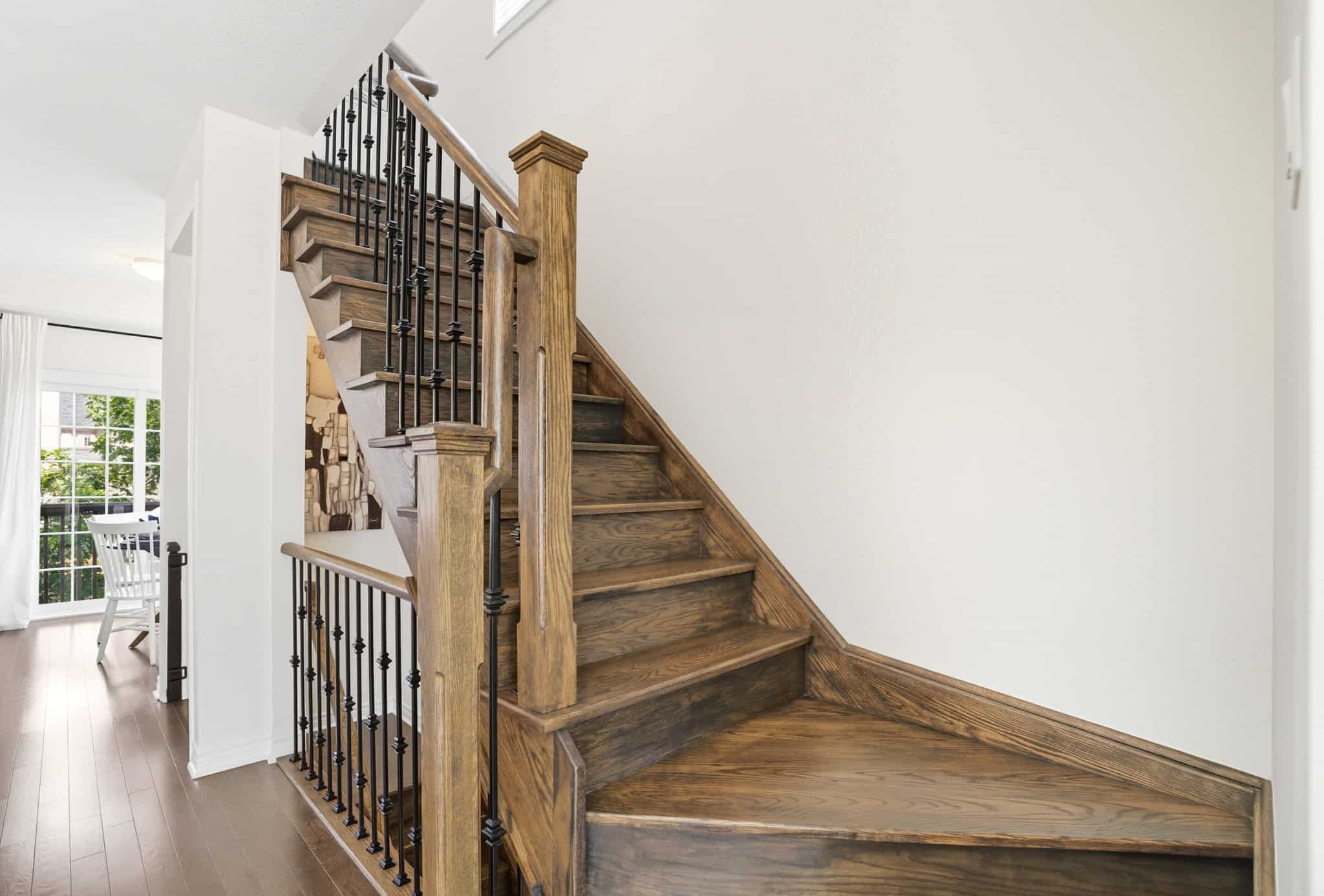 The main floor features hardwood flooring throughout. The contemporary kitchen includes stainless steel appliances, a centre island with quartz countertops / breakfast bar and lots of "pots & pans" drawers. A walkout from the dining area to a balcony overlooking the backyard is ideal for entertaining or enjoying summer evenings. The main floor is completed with a spacious living room featuring an additional walkout to a balcony. There is also a main floor laundry and a powder room.