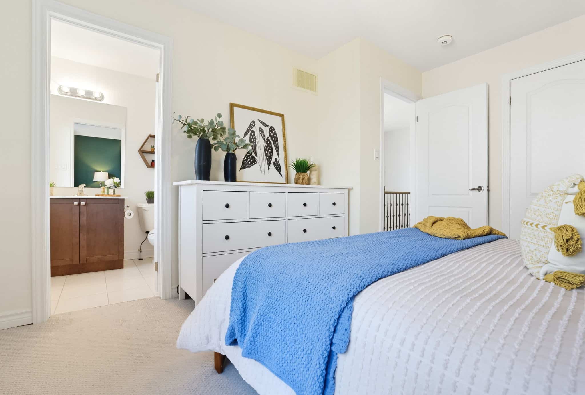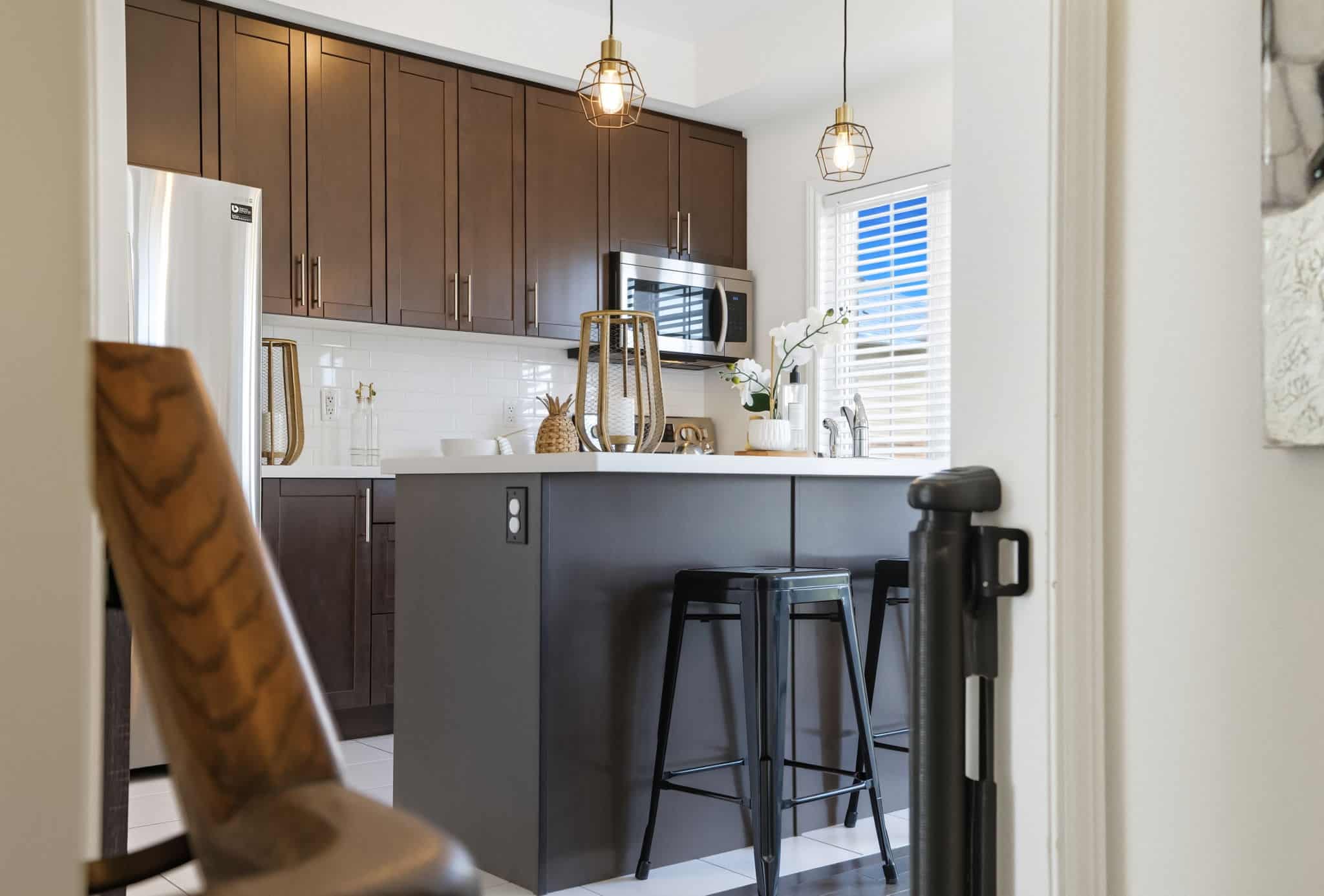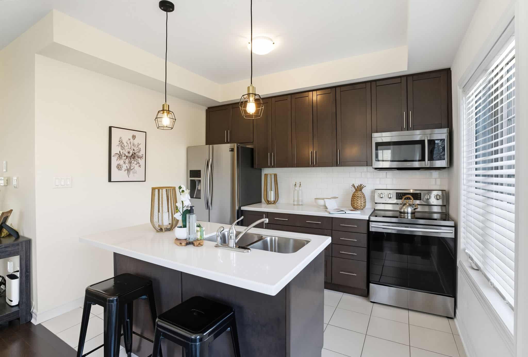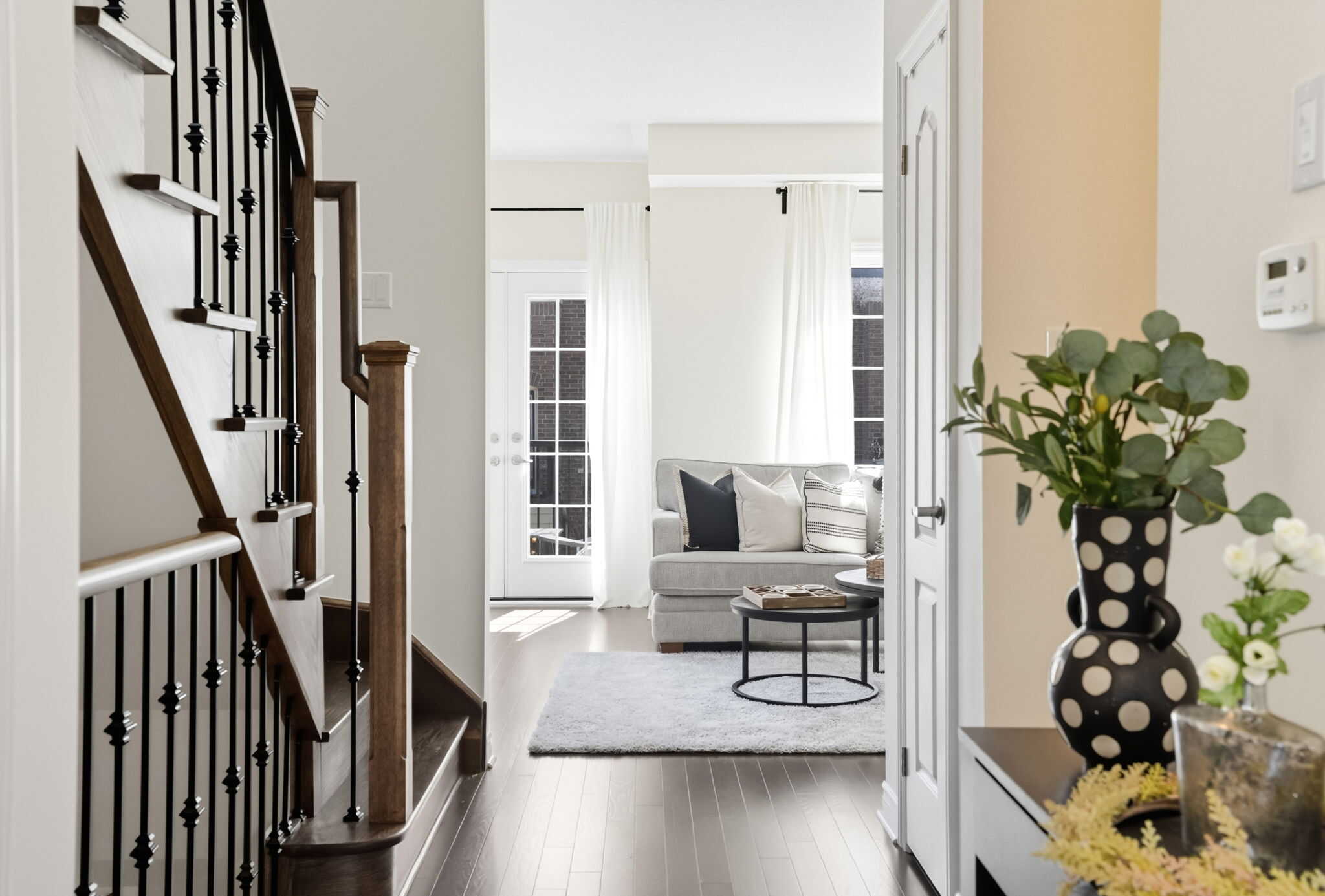 The main floor features hardwood flooring throughout. The contemporary kitchen includes stainless steel appliances, a centre island with quartz countertops / breakfast bar and lots of "pots & pans" drawers. A walkout from the dining area to a balcony overlooking the backyard is ideal for entertaining or enjoying summer evenings. The main floor is completed with a spacious living room featuring an additional walkout to a balcony. There is also a main floor laundry and a powder room.