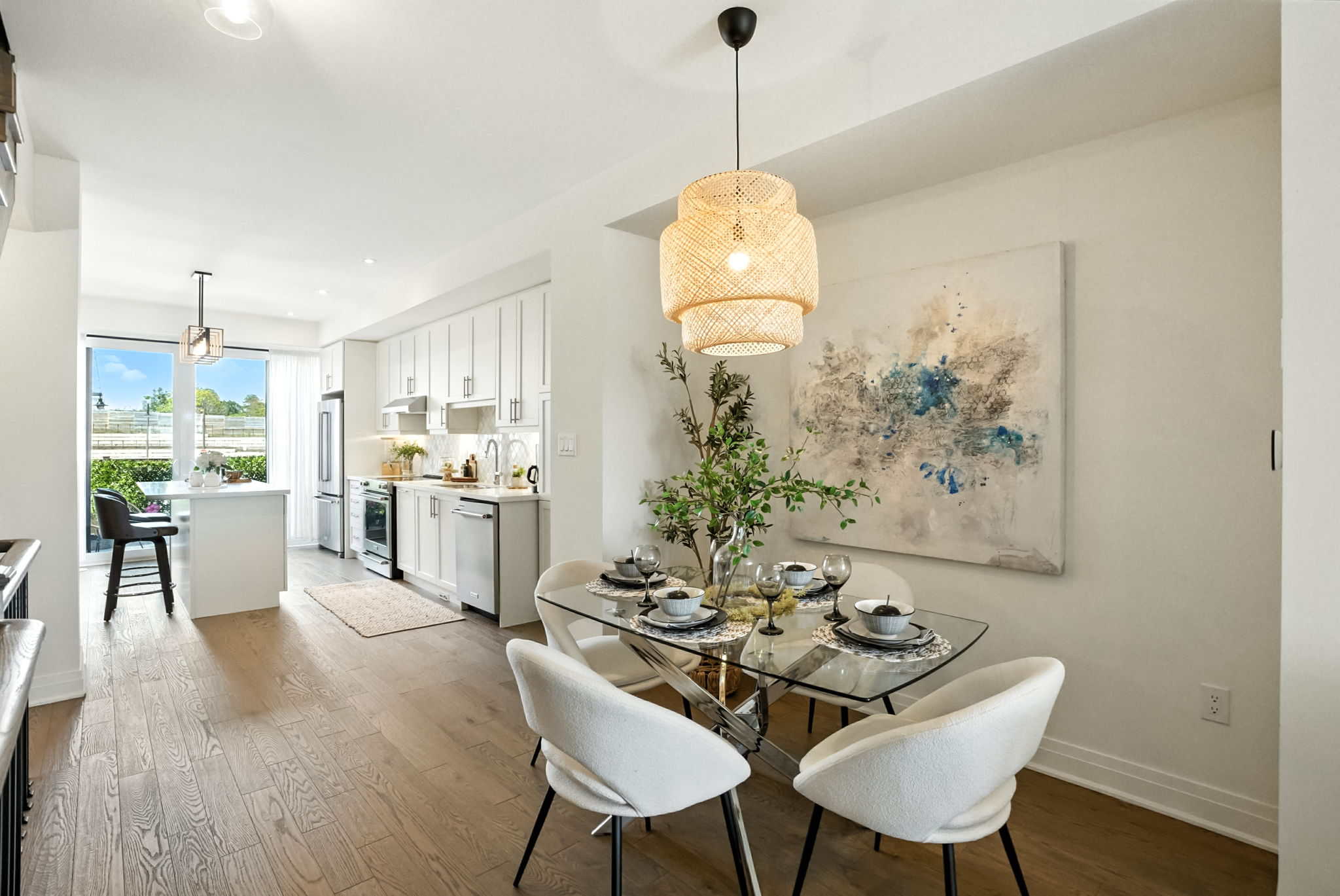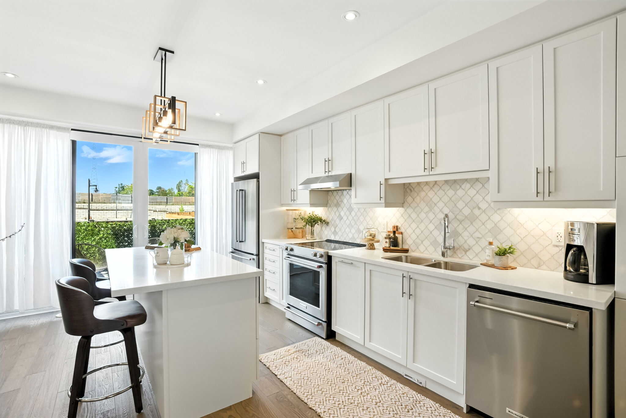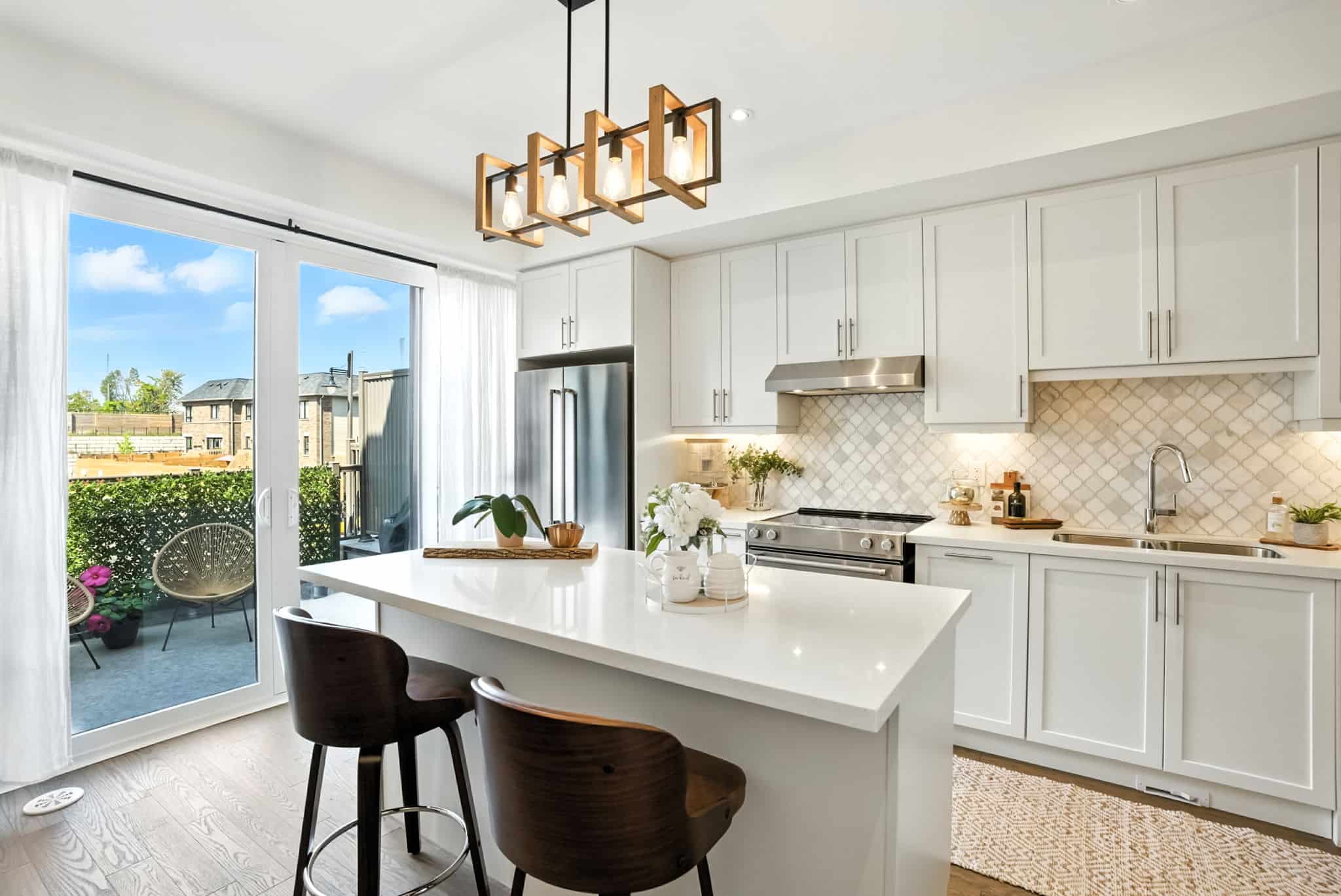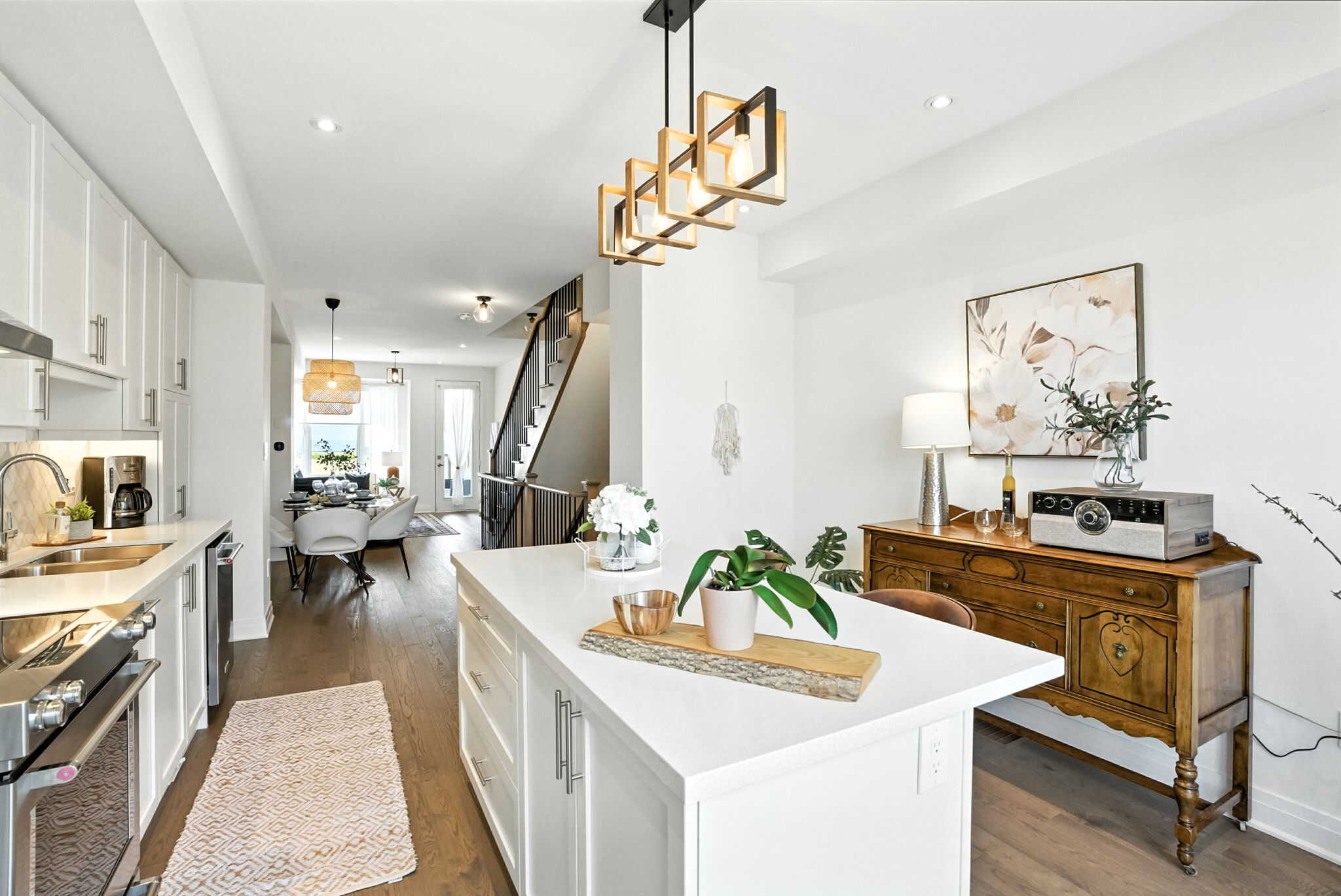 The main level boasts a bright open-concept layout, seamlessly connecting the modern kitchen, dining, and living areas. The gourmet kitchen is a showstopper with quartz countertops, a large centre island with a breakfast bar, upgraded cabinetry with pots & pans drawers, pantry, and stylish backsplash. Step through sliding glass doors to a generous terrace complete with a gas BBQ hookup—perfect for entertaining.