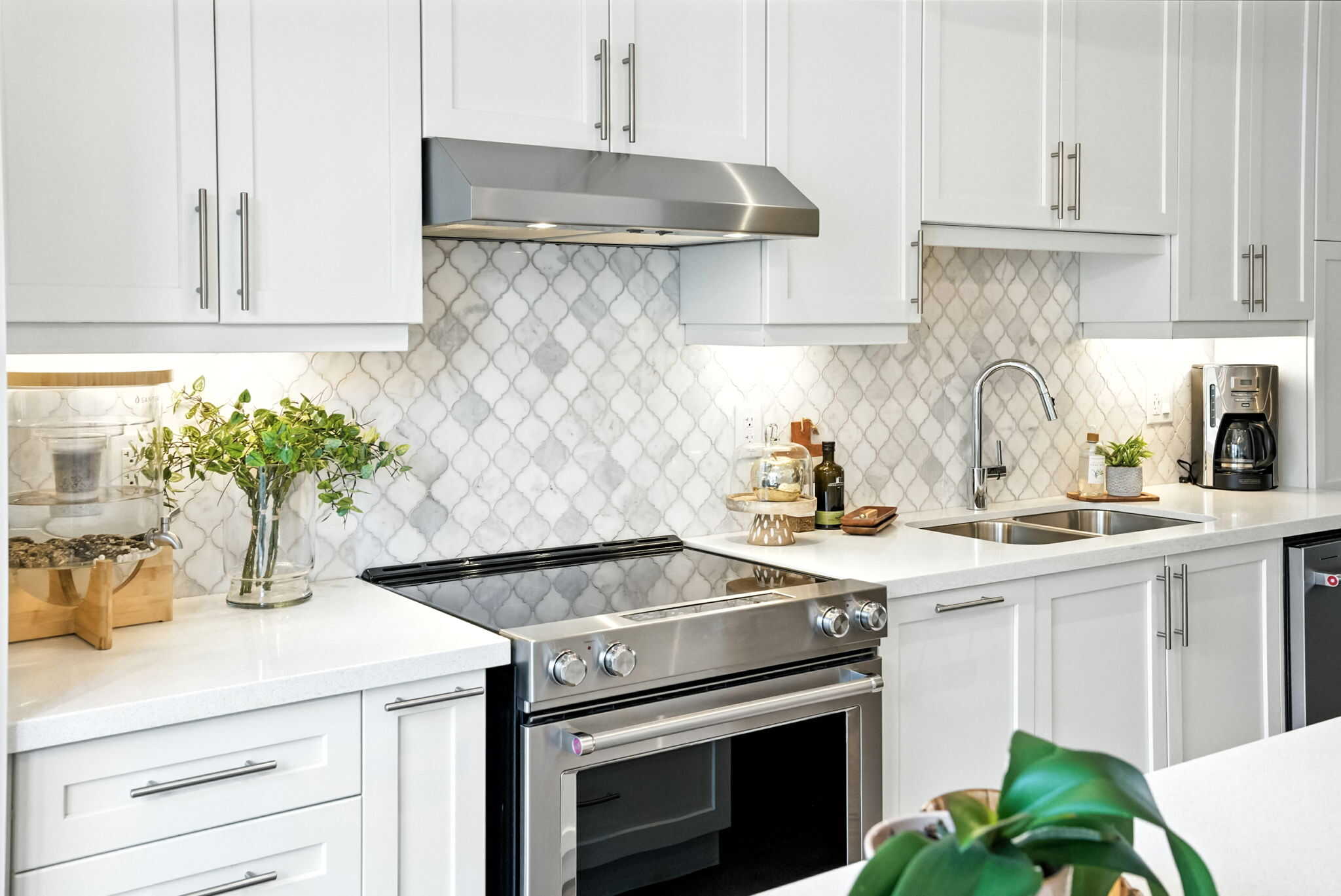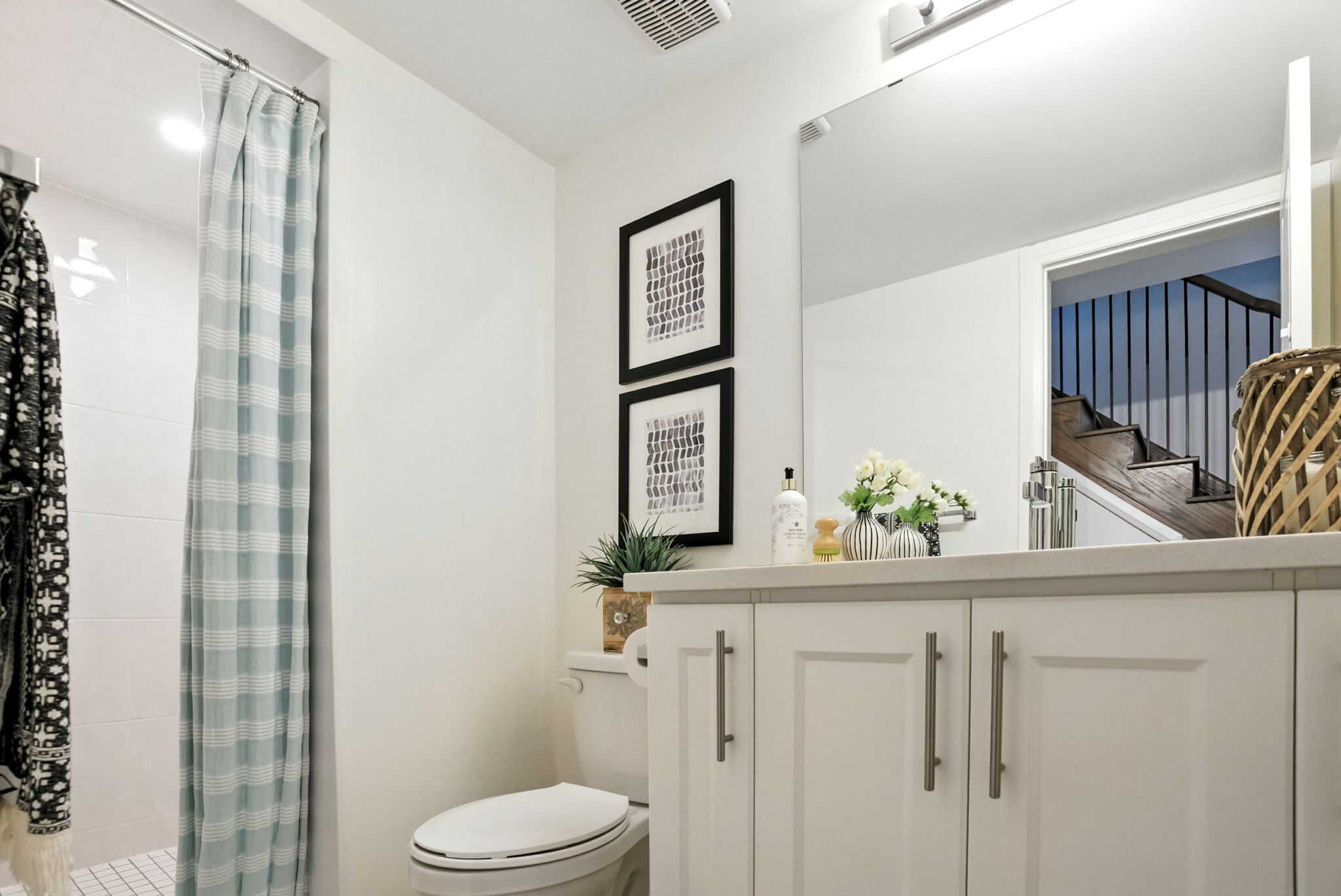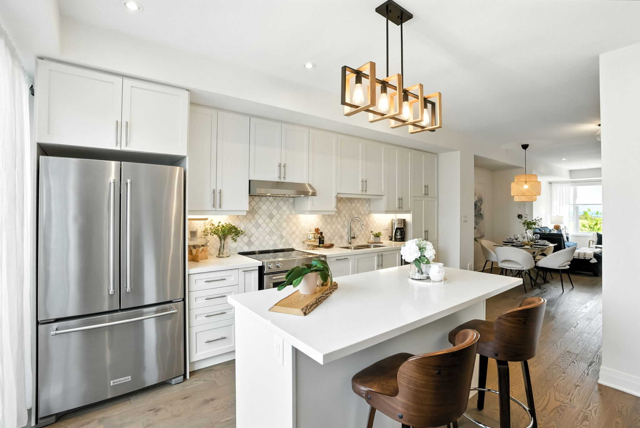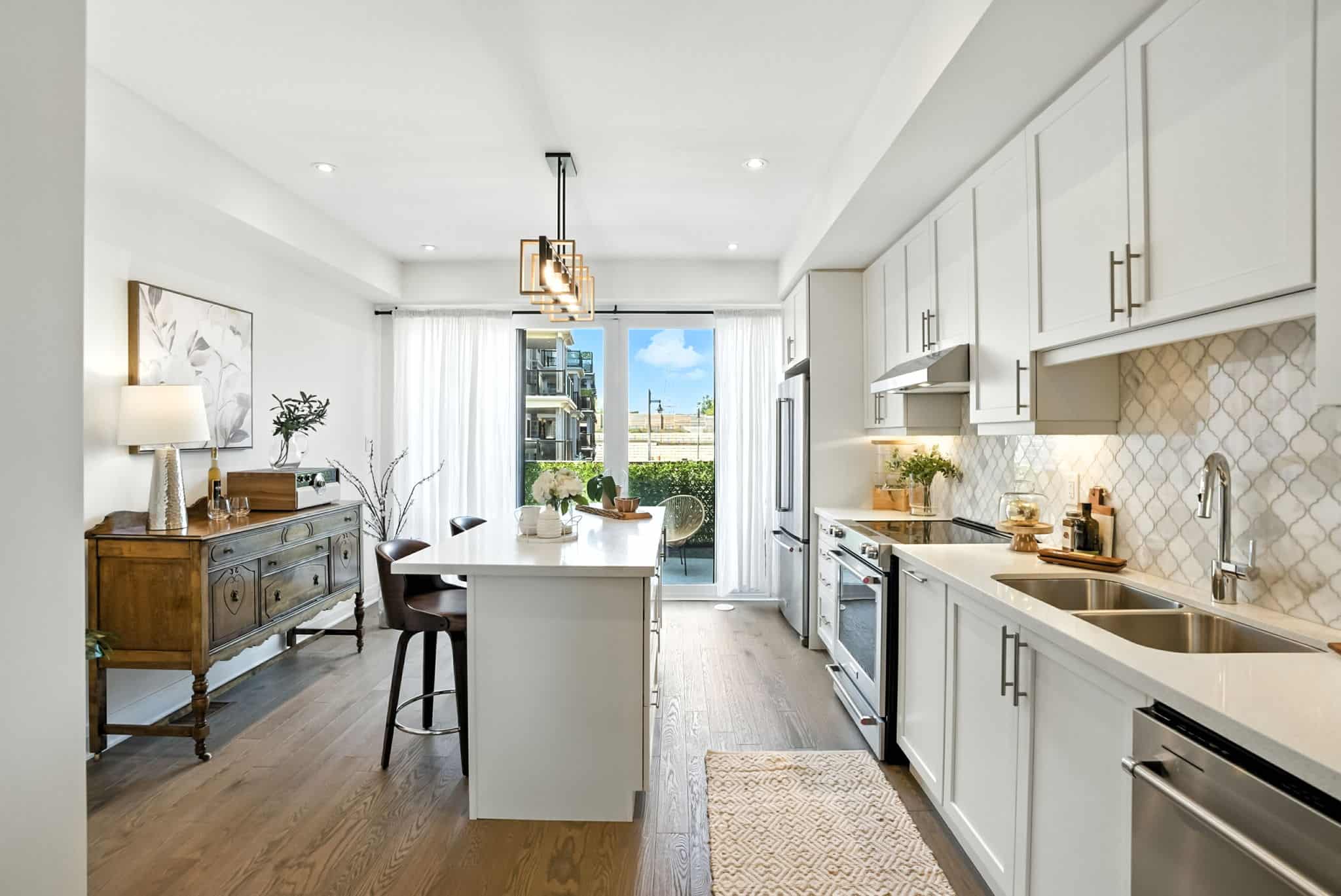 The main level boasts a bright open-concept layout, seamlessly connecting the modern kitchen, dining, and living areas. The gourmet kitchen is a showstopper with quartz countertops, a large centre island with a breakfast bar, upgraded cabinetry with pots & pans drawers, pantry, and stylish backsplash. Step through sliding glass doors to a generous terrace complete with a gas BBQ hookup—perfect for entertaining.