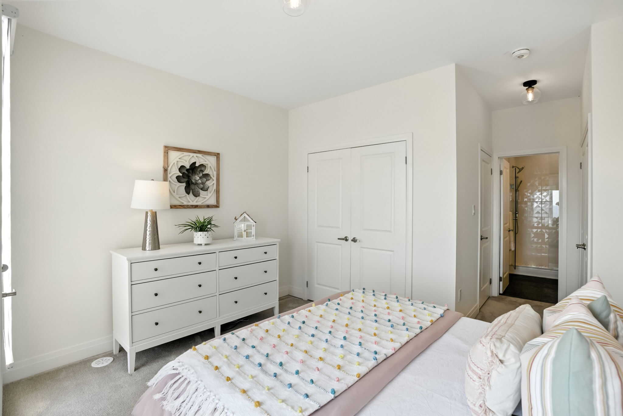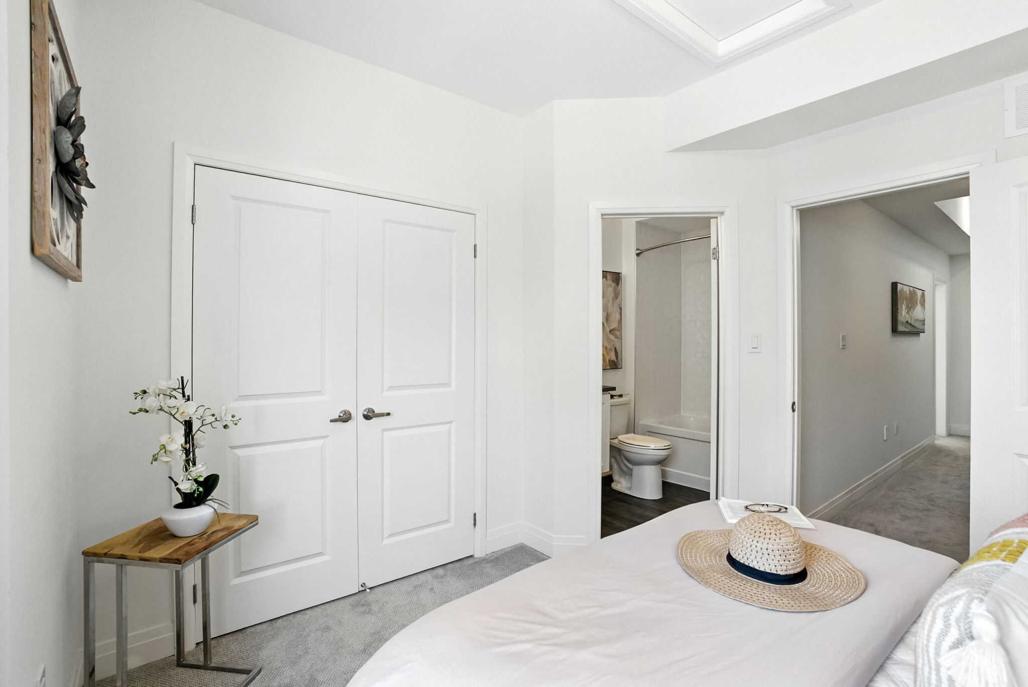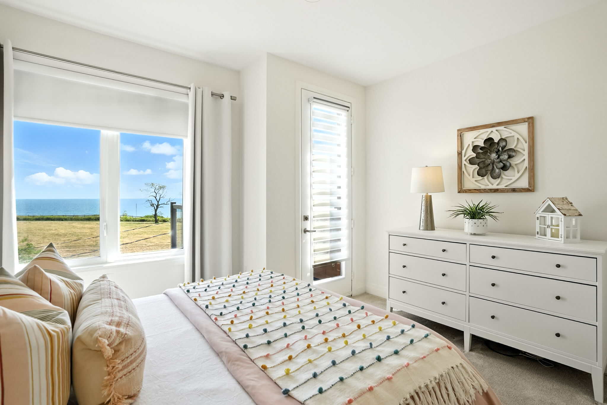 The primary suite is a true retreat, featuring his-and-hers closets, a private balcony with stunning lake views, and a spa-like ensuite with a glass shower. The second bedroom also enjoys its own ensuite and large closet. The ground level offers a third bedroom, full bathroom, and interior access to the garage with epoxy flooring.