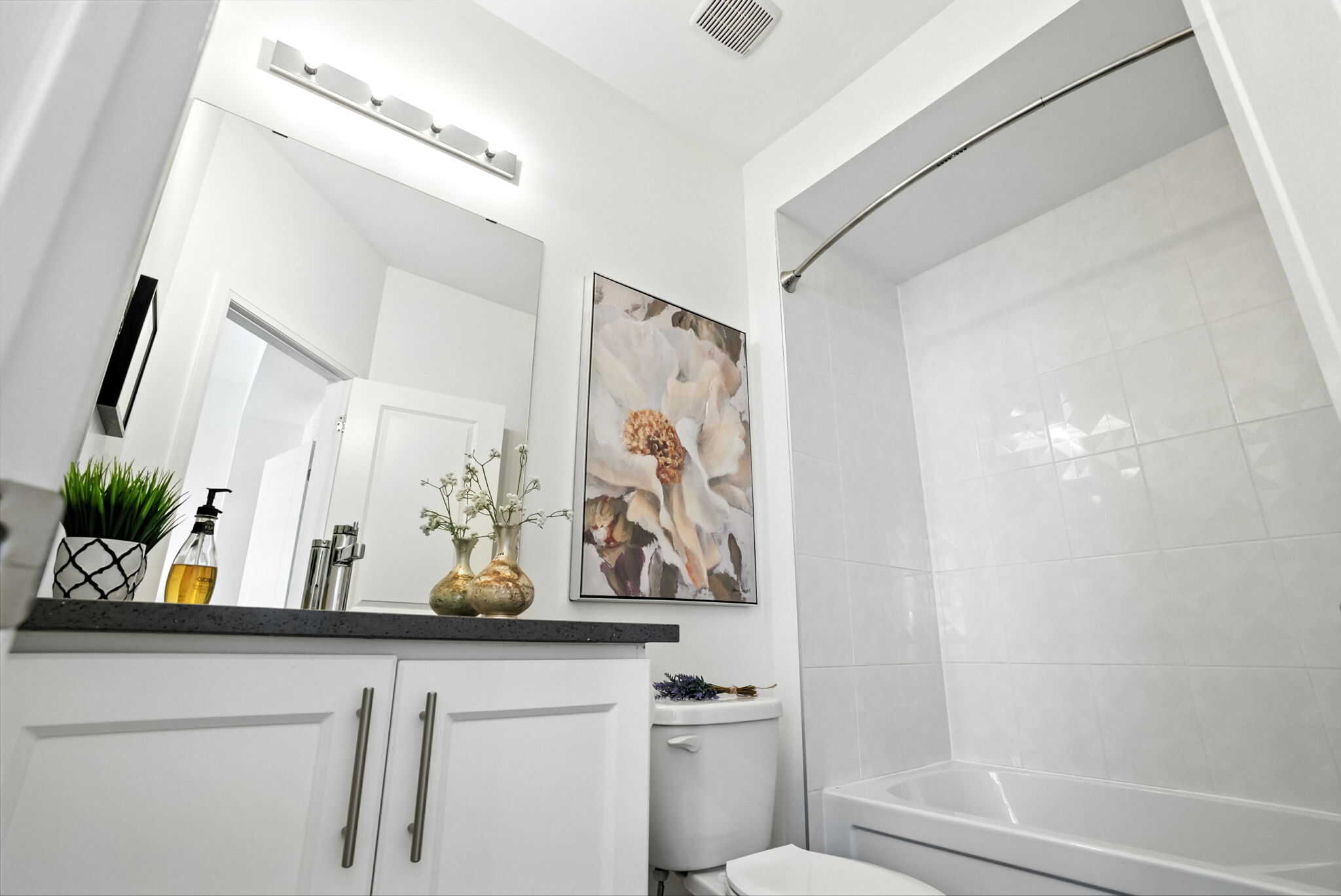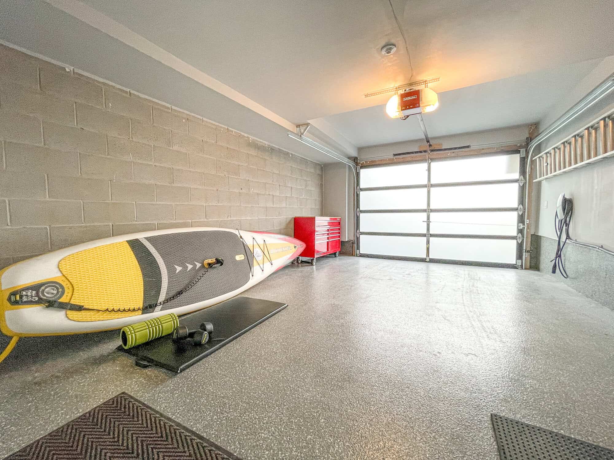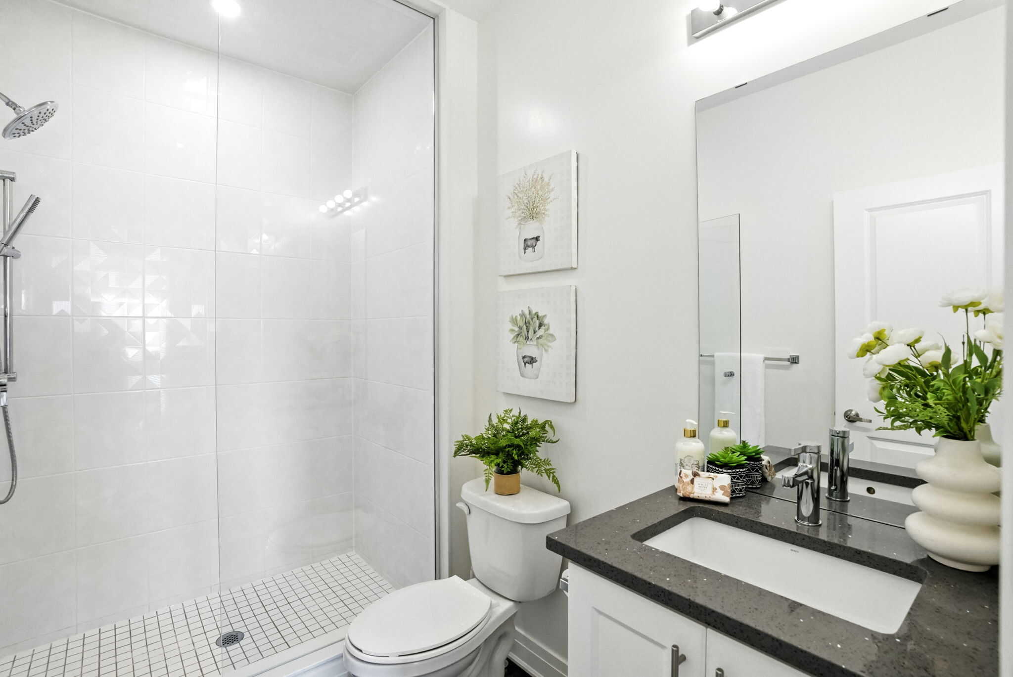 The primary suite is a true retreat, featuring his-and-hers closets, a private balcony with stunning lake views, and a spa-like ensuite with a glass shower. The second bedroom also enjoys its own ensuite and large closet. The ground level offers a third bedroom, full bathroom, and interior access to the garage with epoxy flooring.